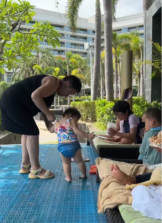 连女士称,10月10日下午1点半左右,她和1岁孙女在酒店泳池游泳上来,她领着才学会走路的孙女就在泳池边遭遇毒虫的袭击。