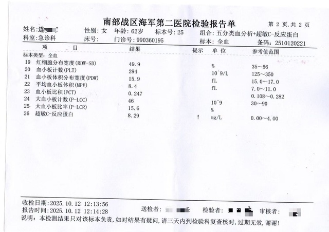 “经过化验检查,我孙女是凝血异常,医生建议住院观察治疗;我化验是血里有炎症,超敏C-反应蛋白超标100%,也得观察。”